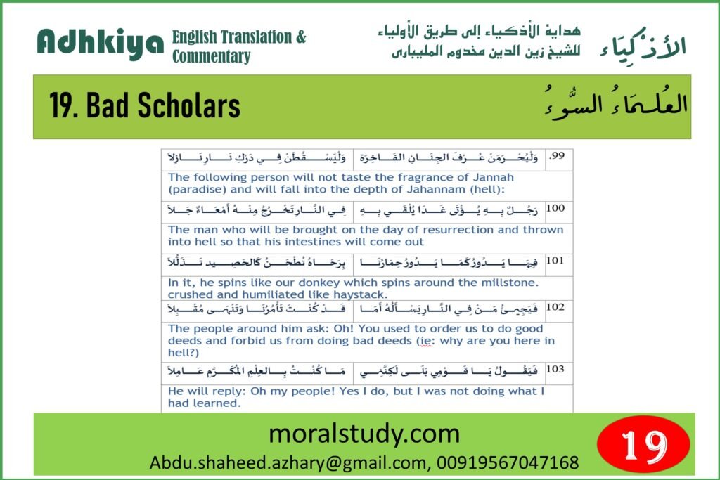 “A man will be brought on the Day of Resurrection and thrown in the (Hell) Fire, so that his intestines will come out, and he will go around like a donkey goes around a millstone. The people of (Hell) Fire will gather around him and say: O so-and-so! What is wrong with you? Didn’t you use to order us to do good deeds and forbid us to do bad deeds? He will reply: Yes, I used to order you to do good deeds, but I did not do them myself, and I used to forbid you to do bad deeds, yet I used to do them myself.”.”