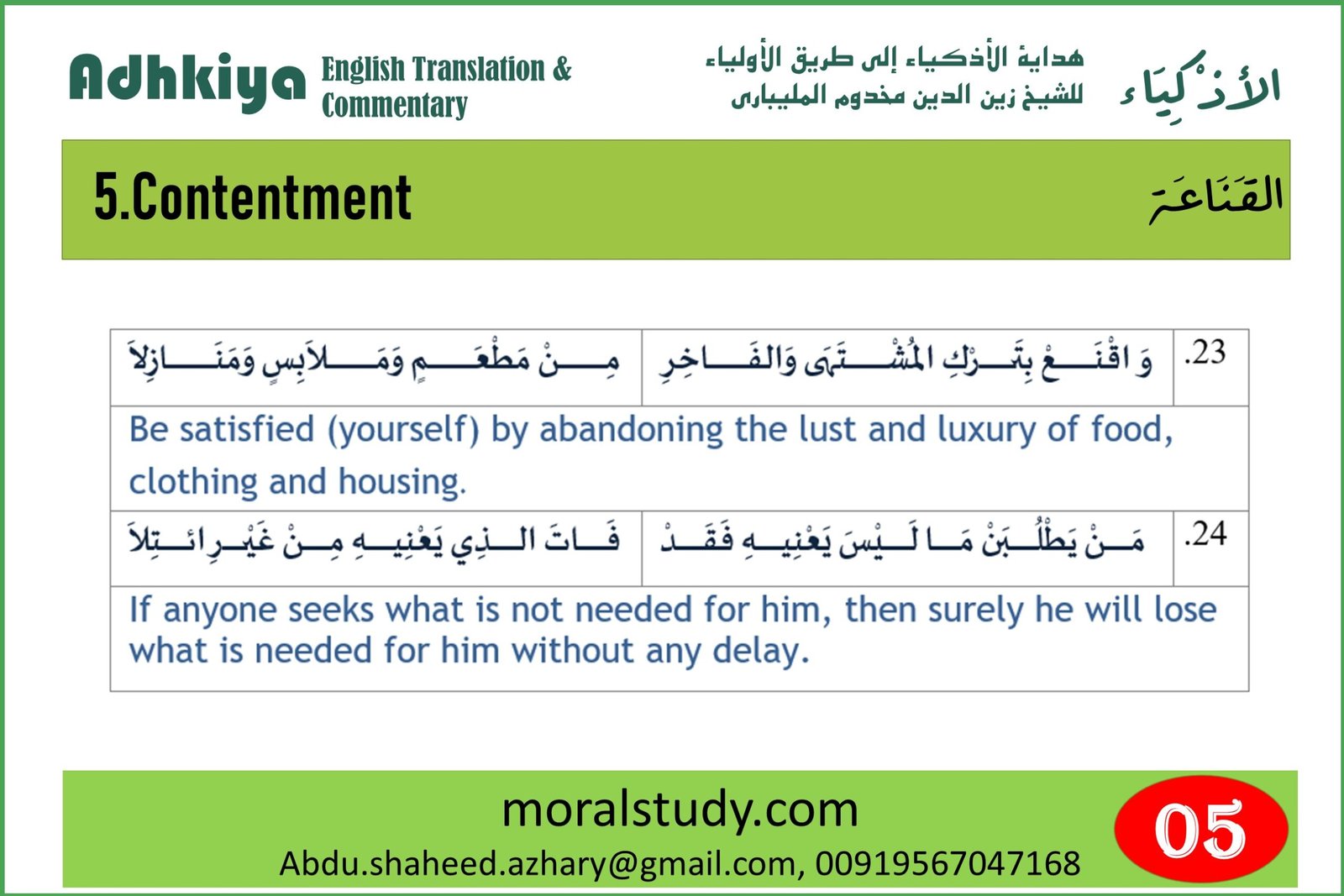 Contentment prevents one from begging. He is always rich in his inner thoughts. It allows him to perceive Baraka in his life, Without Qana’a (contentment) one cannot feel Baraka in food, clothing, house or in any other area of his life.