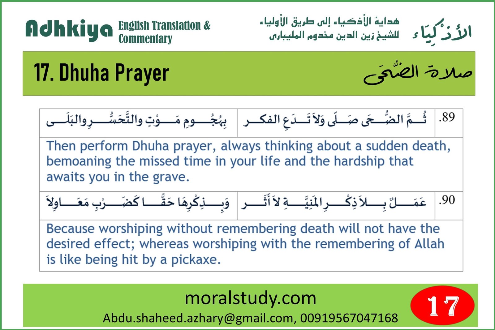 The Author makes an important point here by saying that one should offer Dhuha prayer (forenoon prayer) by remembering about sudden death. It is possible that sudden death can come at any time. One should be prepared to face death by doing as many good deeds as possible. Remembering of death increases the quality of the worship and it increases the sincerity of the worshippers.
