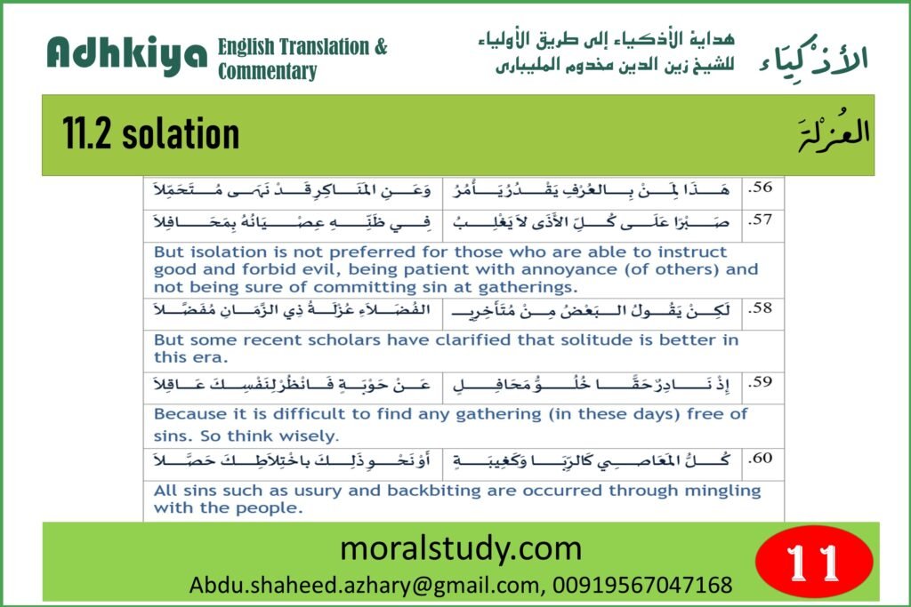 By meeting with people one forgets about himself and gets occupied with chitchat with others which leads to backbiting and gossip. Friends and relatives would be one of the major causes of one’s failure if they kept giving him wrong signals, dispiriting from the personal development. Bad people always beautify the false and disfigure the good, Ibn Ataillah t said in his Hikam