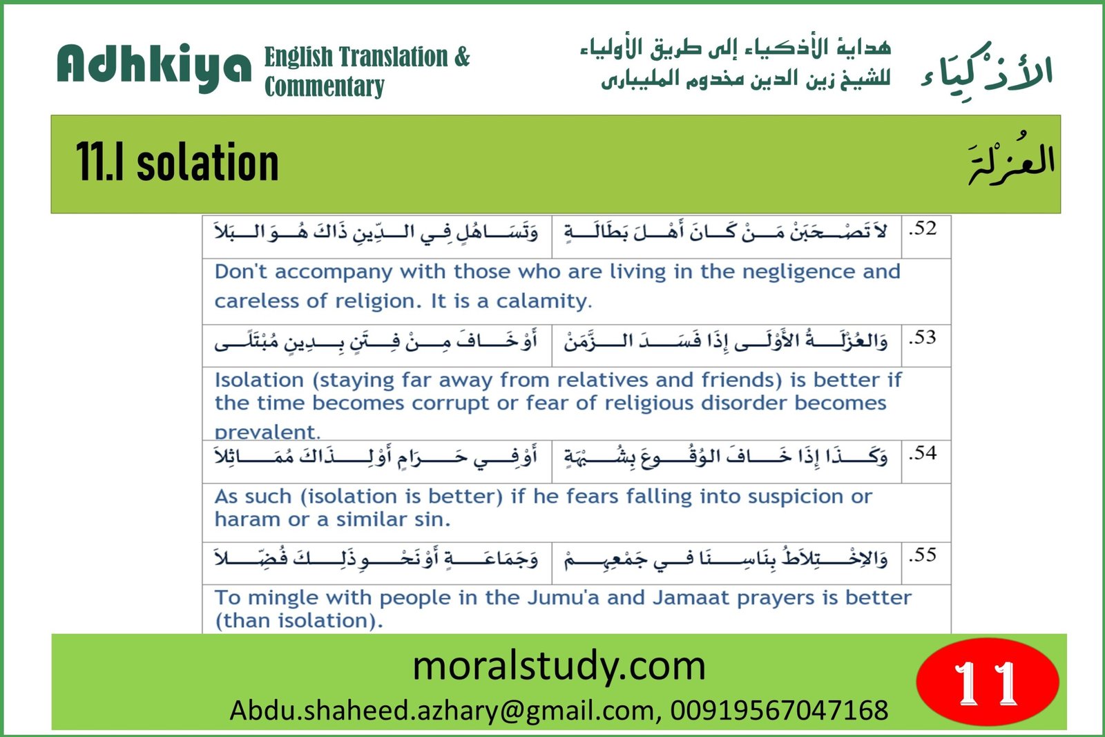 By meeting with people one forgets about himself and gets occupied with chitchat with others which leads to backbiting and gossip. Friends and relatives would be one of the major causes of one’s failure if they kept giving him wrong signals, dispiriting from the personal development. Bad people always beautify the false and disfigure the good, Ibn Ataillah t said in his Hikam
