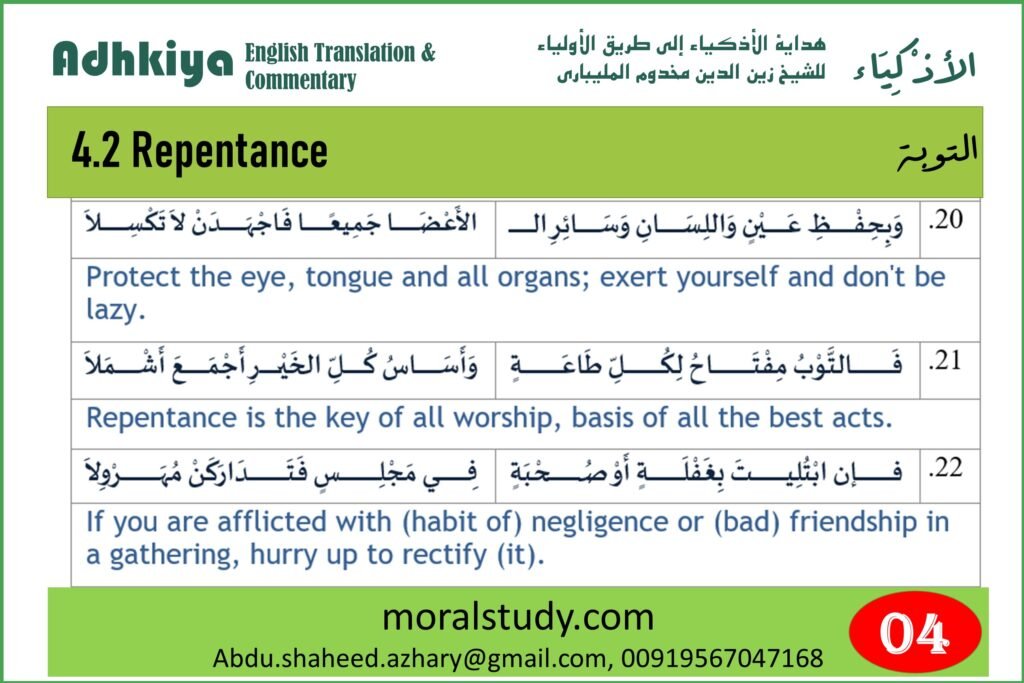 For these reasons, the author says one has to hasten to perform repentance as soon as he commits sin. When he forgets to do Tawbah because of worldly engagements, he should try to do it once he remembers it.