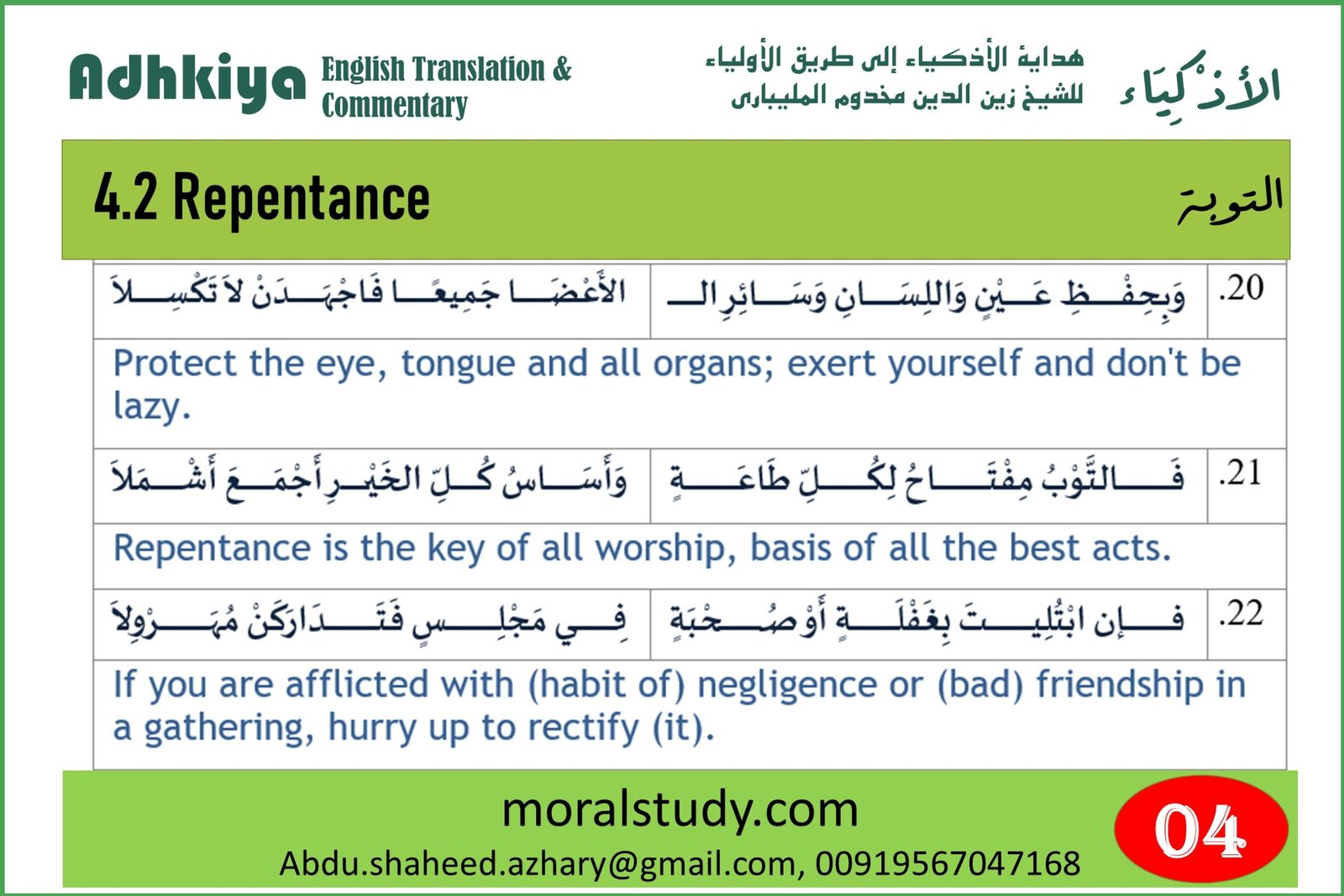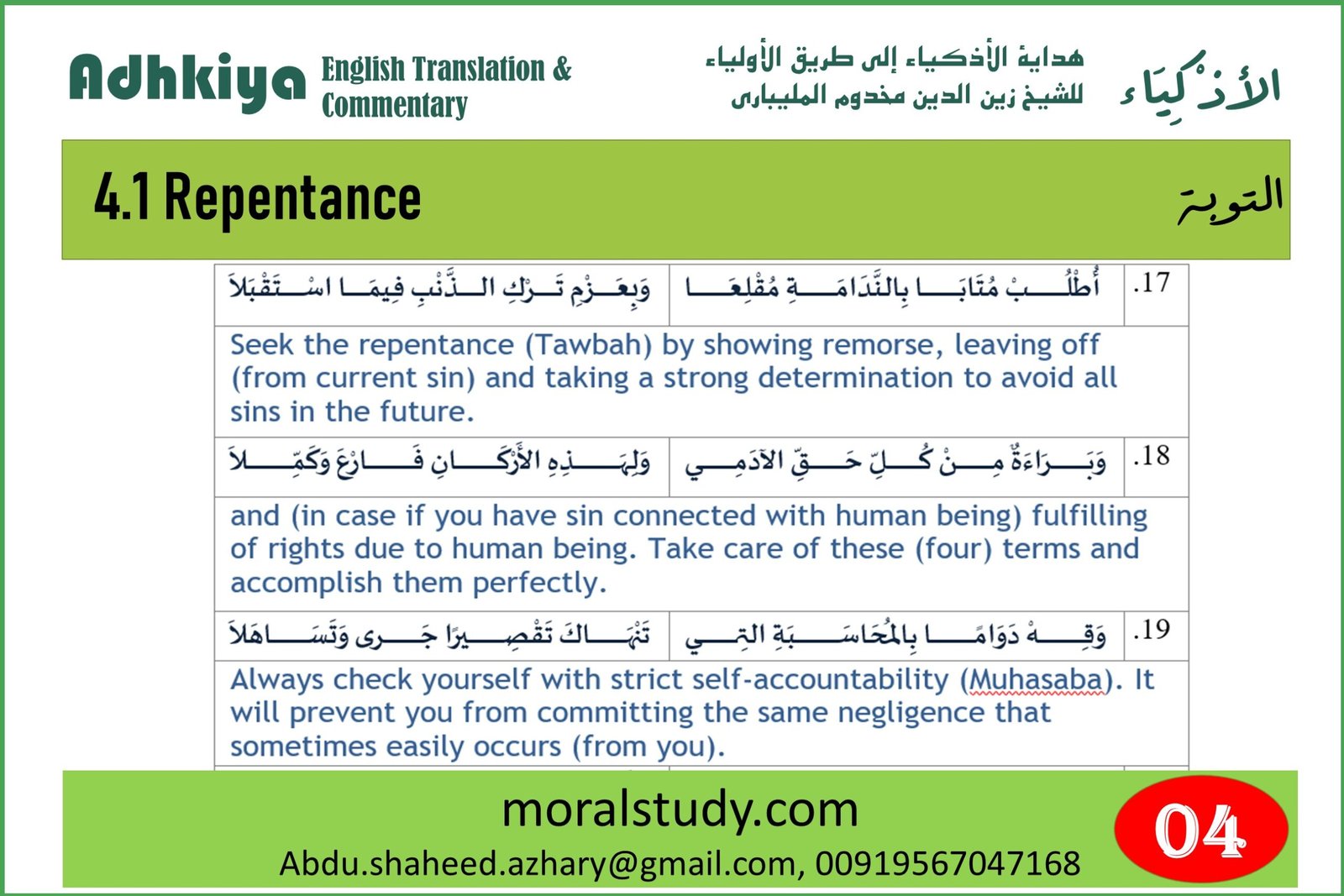 Repentance of these sins comes through remorse and regret, and also by calculating their measure with regard to magnitude and duration, and performing for each of these sins a corresponding good deed. He should perform good deeds in proportion to the measure of the transgression relying on the Prophet’s saying ‘Fear God wherever you are and follow an evil deed with a good one to wipe it out’.