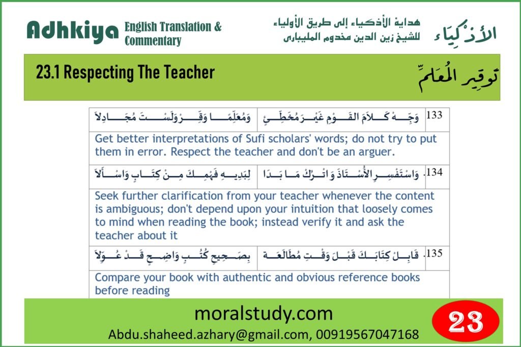The teacher is required to be very authentic and reliable in his teachings. His teachings are the light of the students’ lives. Before coming to class room, he should be very careful about the subject. The Islamic teacher is not just giving the linguistic meaning of the words from text books, rather he should be aware of the different aspects of the subject by reading some of the more accurate books on the subject.