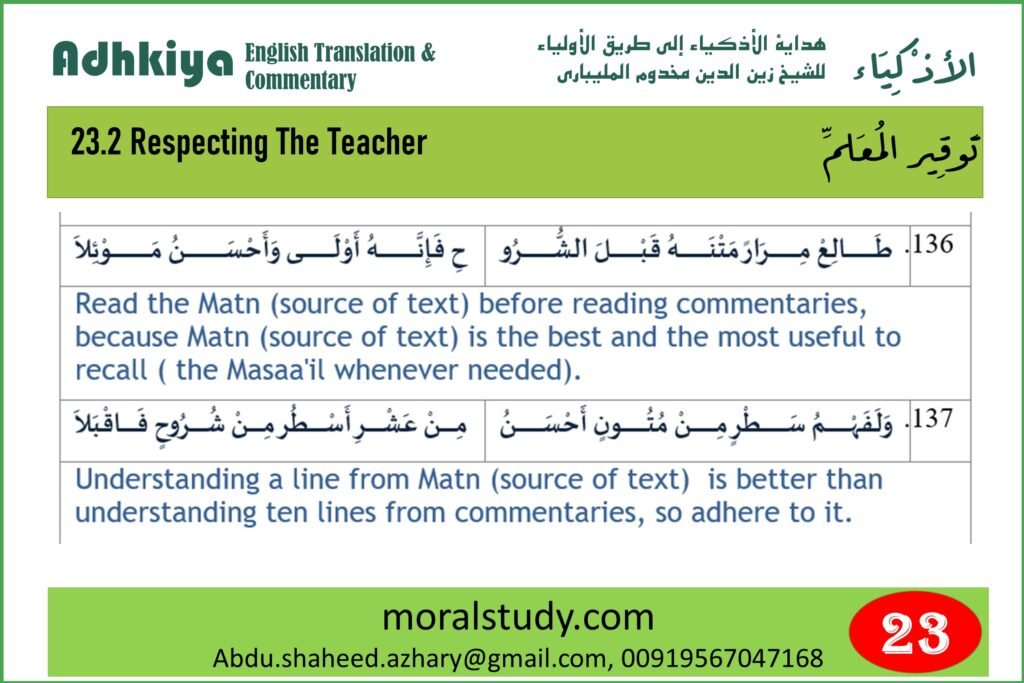 Shara’h is an explanation of the Matn. It gives further information about various parts of the subject mentioned in the source text (Matn). Although Shara’h is important in understanding the true meaning of Matn, it is recommended to read out Matn many times until he memorizes it.