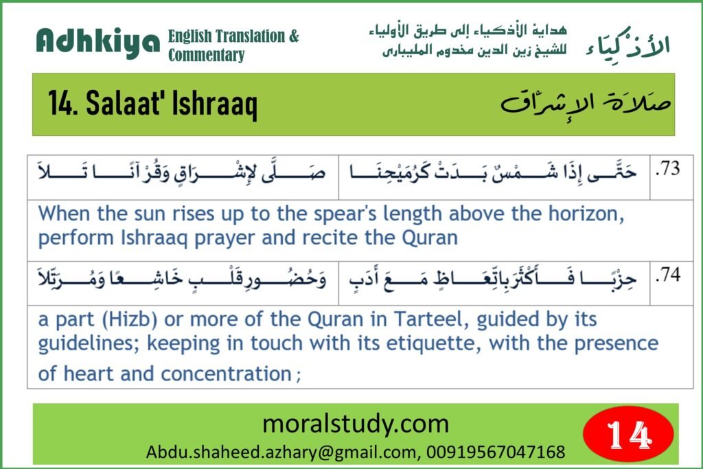 Scholars differ regarding whether the Ishraaq prayer is a separate name for Dhuha prayer or if it is a separate prayer. The Author has chosen the second opinion. The preferred opinion is that it is just another name for the Dhuha prayer. Some scholars have said that there are two Dhuha prayers and they call the Ishraaq prayer a minor Dhuha prayer. The time of this prayer comes immediately after the sun rises at spear length (10-20 minutes). The hadith on the virtue of Wird after Subh prayer mentions two Raka’a prayers. That prayer is Salaat al Ishraaq according to the scholars.