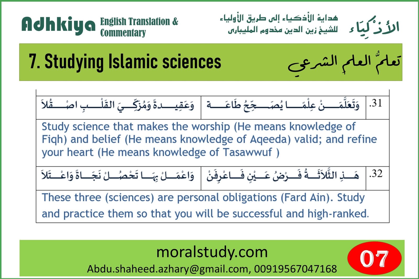 Shiekh Zainudin here says that studying these three basic branches of knowledge: Aqeeda (Islamic theology), Fiqh (Islamic jurisprudence) and Tasawwuf (Islamic mysticism) is the Fard Ain or personal obligation of every Muslim.